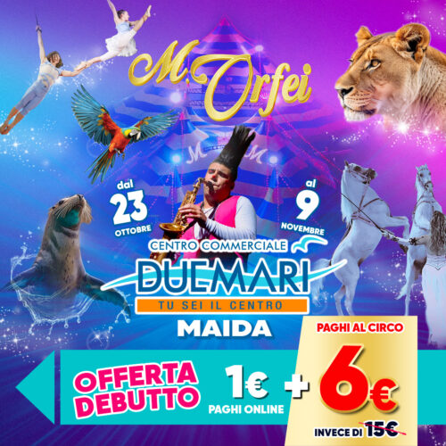 Circo M. Orfei al Centro Commerciale Duemari Maida: prenota le offerte per i biglietti scontati su bigliettoprenotato.it Arriva il nuovo imponente spettacolo M. ORFEI. NUOVA PRODUZIONE 2025. Gli animali esotici, i Leoni e le Tigri e tanti artisti internazionali.…………….E’ TUTTO VERO!! Un straordinario show da non perdere, magistralmente coreografato e ben diretto che vanta fin ad ora di oltre 1.000.000 di spettatori